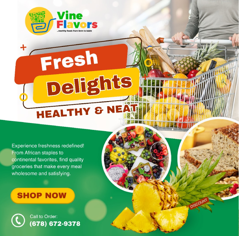 Bring The World To Your Kitchen! Start Shopping Now! Grocery Essentials Beverages & Drinks Bread & Snacks Miscellaneous Afro Caribbean Hispanic Groceries Asian Groceries Arabian Groceries European Delights God Bless America Fresh Produce Fresh Fruits Fresh Vegetables Herbs & Leaves Frozen Foods Frozen Fish & Seafood Frozen Meats Frozen Vegetables Wellness Hive Bags & More Beauty & Health Body & Soul Care Jewelry & Fabrics Mental Health Grain & Flour Packaged Goods Household Depot Products made/packed by Vine Flavors Discounted Pricing!Grocery EssentialsFrom All Over The World! Shop Now Come See Us In Person! Vine Flavors 917A Glynn St. NFayetteville, GA 30214678-525-9070 Deal Of the day HOSTESS Cinnamon Coffee Cake, Topped with Streusel, Individually Wrapped, 8 Count, 11.6 oz (Pack of 4 boxes) $39.99 Add to Cart Snyder’s of Hanover Honey Mustard & Onion Flavored Pretzel Pieces, 11.25 oz $3.62 $4.02 Add to Cart Mission Street Taco Flour Tortillas, Mini Soft Taco Size, 12 Count $2.69 Add to Cart Klass Aguas Frescas Hibiscus, with Vitamin C, Multiserve, Powdered Drink Mix, 14.1oz $2.86 $3.26 Add to Cart Garri (White) Add to Cart Cheez-It Original Snack Mix, Lunch Snacks, 17.8 oz $5.27 $5.86 Add to Cart Jacob’s Original Cream Cracker $2.76 $4.00 Add to Cart Quaker Original Quick 5-Minute Grits, Shelf-Stable, 24 Oz Canister $2.88 Add to Cart Driscoll’s Raspberries $1.99 Add to Cart Treding products Delivery AvailableGet Up To 30% Off Shop Now Sweets & SnacksFrom All Over The World! Shop Now Spices & SeasoningsMinimum 10% Off Shop Now All Your Favorite DrinksGet Up To 5% Off Shop Now Shop By Category Hispanic Groceries Asian Items Afro Caribbean Products Arabian Treats European Delights Grocery Essentials View Now African Fresh Produce View Now Frozen Foods View Now Packaged Goods View Now Made By Vine Flavors Garri (White) Add to Cart